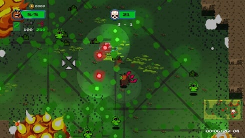 Проект выполнен с использованием классической пиксельной графики и малым количеством деталей в объектах окружения. Упор сделан на красочные спецэффекты и мощные взрывы, занимающие половину экрана. Интерфейс лаконичен и демонстрирует только необходимую информацию. Справа снизу находится карта местности, а сверху, посредине монитора располагается счёт оставшихся противников для перехода на следующий этап. Геймер собирает новые виды оружия во время прохождения, которое имеет разные характеристики, и подходит под отличающиеся стили игрового процесса.